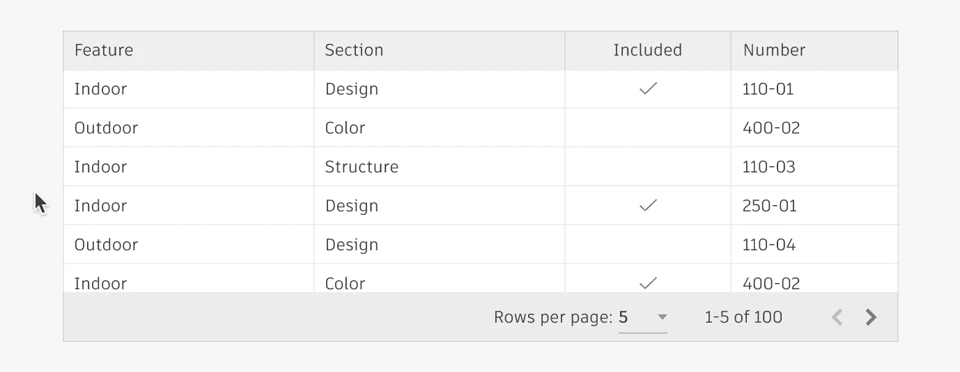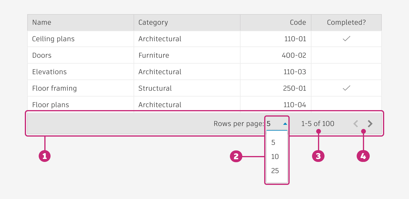 Row per page selector: A dropdown allows selection of the number of rows visible per page. Typically, options are 25, 50, and 100 for desktop, but it can be adjusted to meet your requirements. The dropdown should always use the line variant.