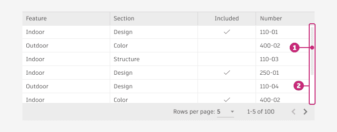 Scrollbar: Always appears within the borders of the table . Can be placed vertically on the right side of the table, and/or horizontally on the bottom of the table. Use padding to ensure there’s adequate space around the scrollbar, to prevent content within the table from being covered or shifted.