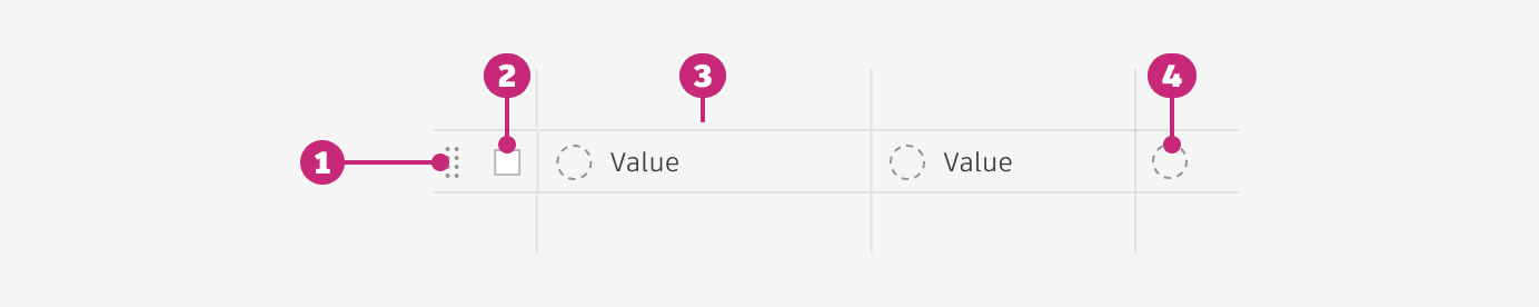Drag handle (optional): An interactive icon that indicates the row is draggable. Persistently visible if a row is draggable.