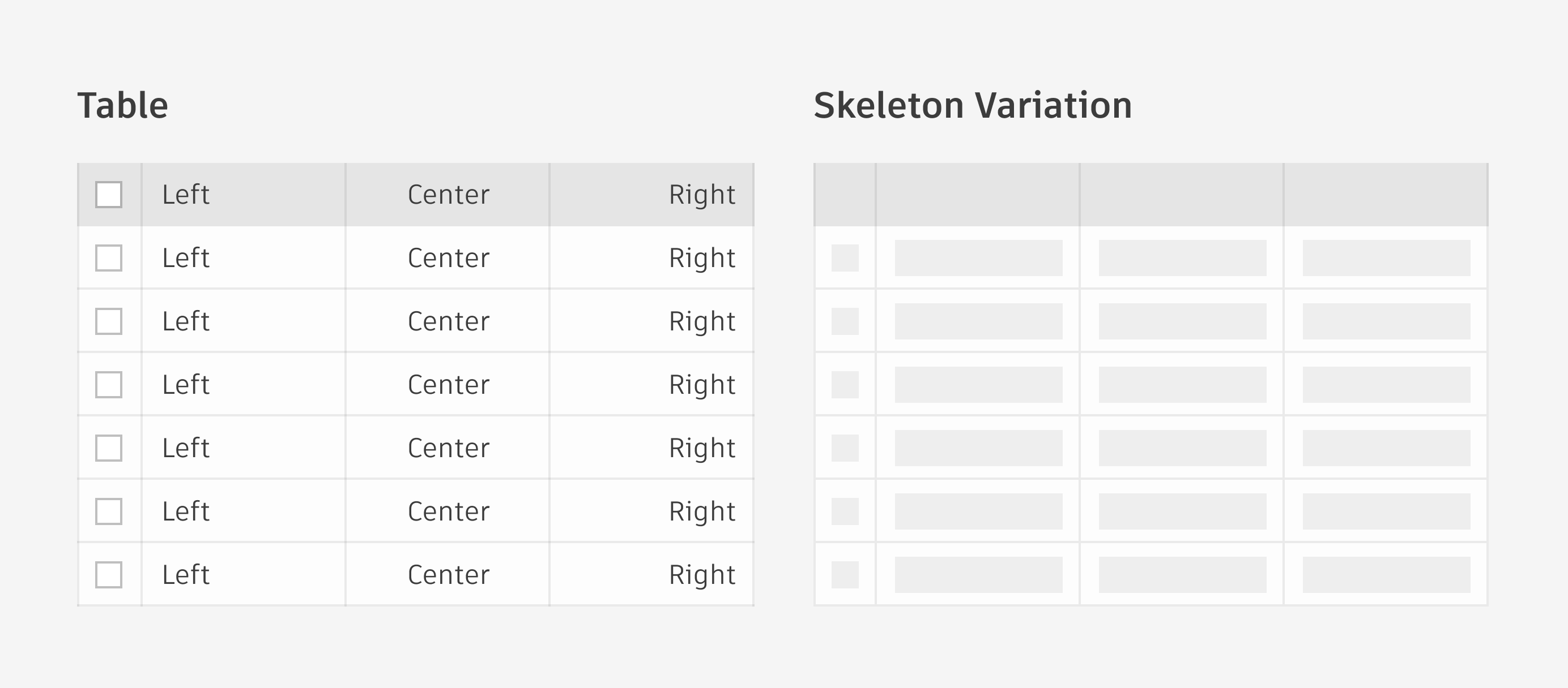 When loading complex components, keep as many “structural” elements of the design static as possible. For example, when loading a table, the dividing lines and column header backgrounds are persistently visible; skeleton loaders are only used to depict the table data itself until it has loaded.